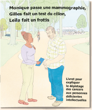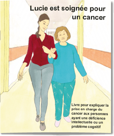 Le livret « Lucie est soignée pour un cancer » réalisé en 2014/2015, est fait de 47 images et textes adaptés qui expliquent de façon simple le trajet diagnostic et thérapeutique du cancer aux personnes qui ont une déficience intellectuelle. Le livret est destiné aux professionnels des établissements de santé, des établissements médico-sociaux accueillant des personnes en situation de déficience intellectuelle ainsi qu’aux familles. Ce livret est distribué gratuitement